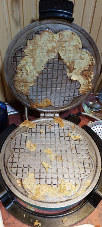 Popi elállja az utamat – mint mindig – a kis méretű konyhában, mert ő is szereti a gofrit. Egy biztos, el kell több évnek telnie, hogy ismét megkíséreljek gofrit sütni.